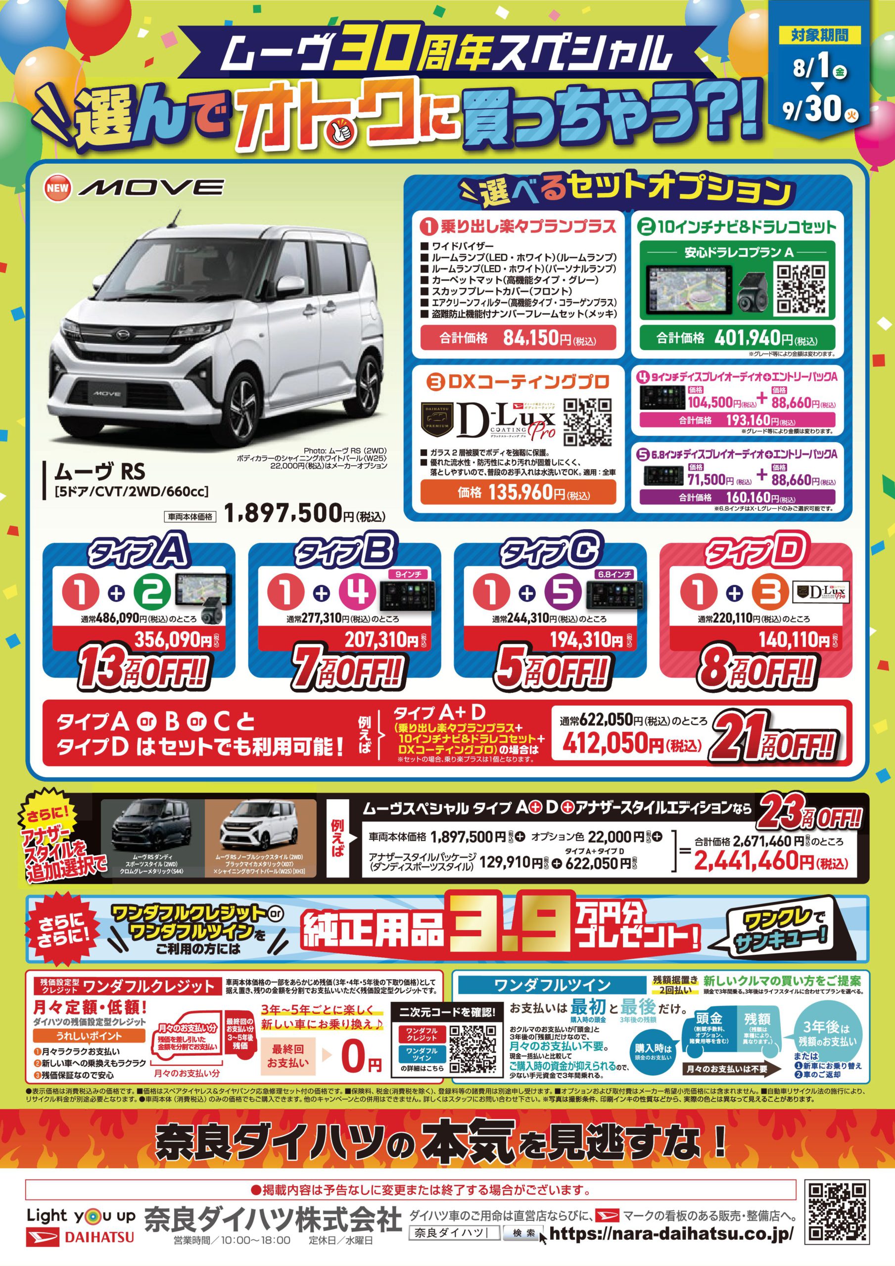 ムーヴ30周年スペシャル登場!! 2025.08.25 キャンペーン ムーヴ30周年スペシャル 選んでオトクに買っちゃう?! 対象車種:新型ムーヴ 期間限定のオトクなプランです! 詳細は、奈良ダイハツ各店にて。 皆様のご来店、心よりお待ちしております。 ■既にご成約済みの車両にさかのぼって適用することはできません。 ■中古車は対象外となります。 ■このキャンペーンは予告なく終了する場合がございます。 ■詳しくは当店スタッフへお問い合わせください。 前の記事へ 記事一覧 次の記事へ