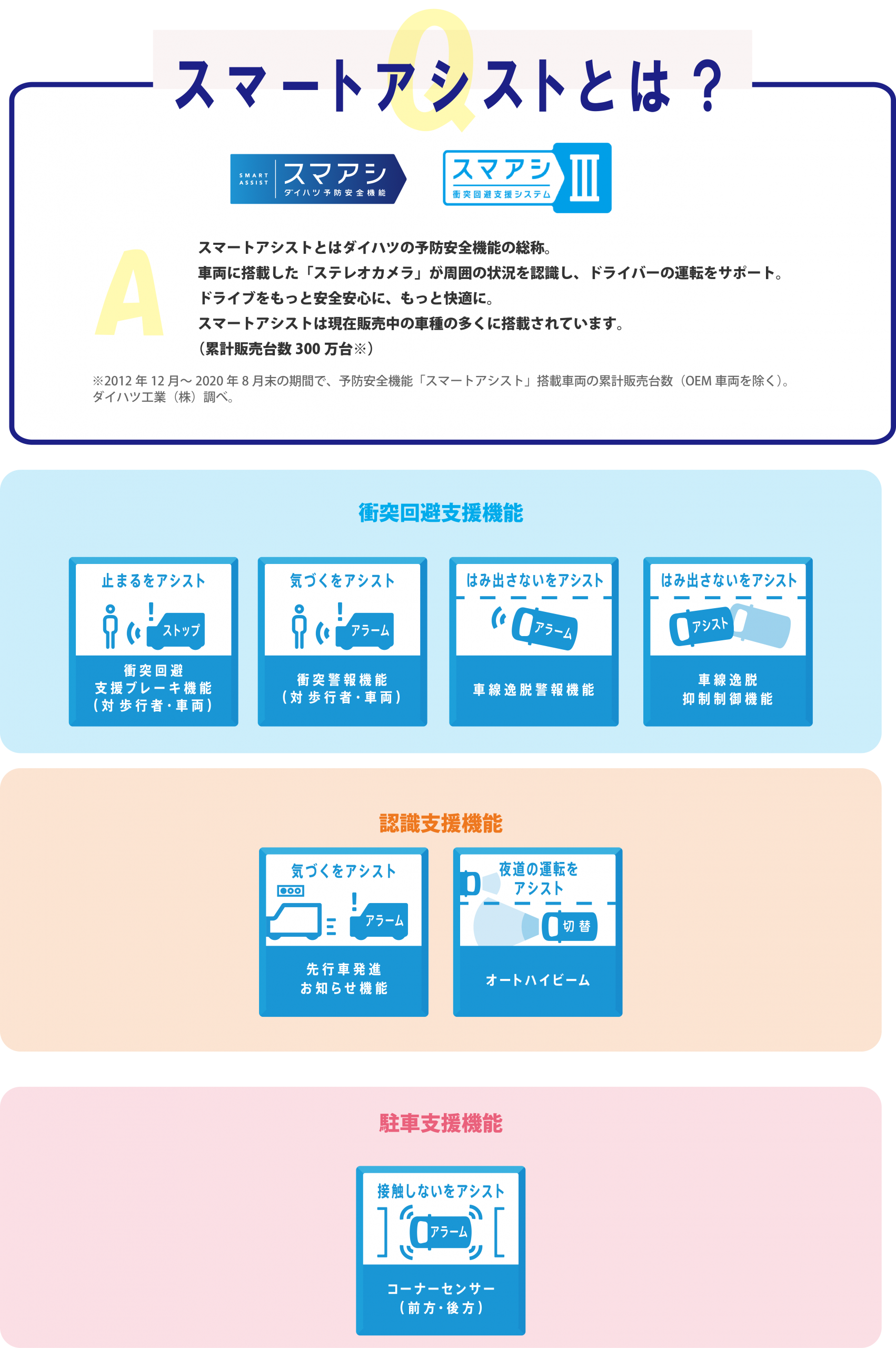 ■[スマートアシストについて]安全機能はあくまで運転を支援する機能です。本機能を過信せず、必ずドライバーが責任を持って運転してください。道路状況、車両状態、天候状態およびドライバーの操作状態等によっては、作動しない場合があります。詳しくはスタッフまでお尋ねいただくか取扱書をご覧ください。