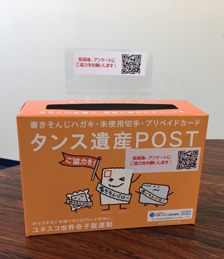 タンス遺産ポストとは、ユネスコ協会連盟様実施している【ユネスコ世界寺子屋運動:あなたの1枚で未来が明るくなる】でハガキや切手を回収するボックスのことです。