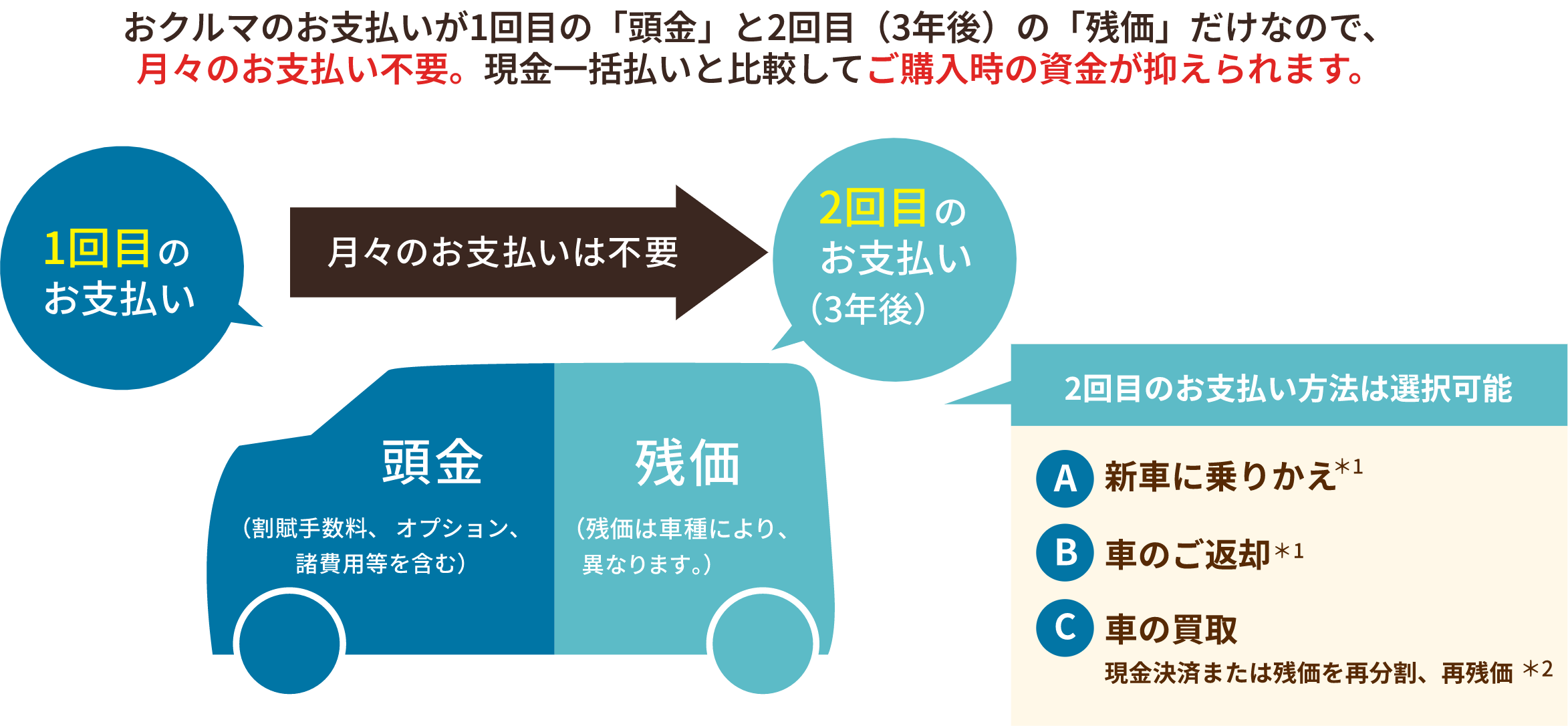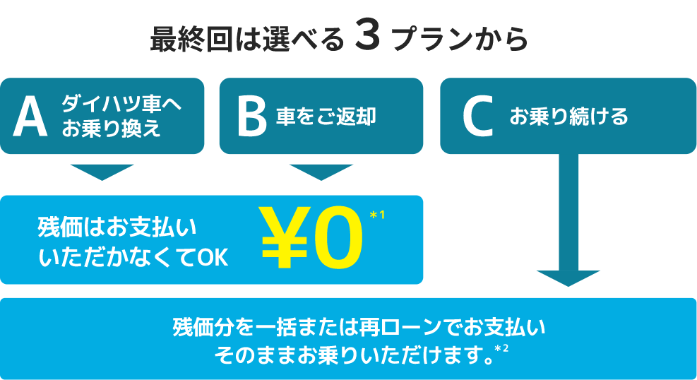 ●設定残価は、車両状態が上記規定内である場合のみ保証いたします。●奈良ダイハツに車両をご返却の上、新車にお乗り換えの場合、およびご返却の場合、残価分のお支払いは不要ですが、車両状態が事前に定められた規定外である場合には、別途精算金をいただきます。(*1)●お乗り続ける場合、再分割利用時の割賦手数料率は、再分割契約成立時点の奈良ダイハツが定める割賦手数料率を適用します。(*2) ●最終回でお買い上げ(現金決済・再分割・再残価)をご選択された場合、最終回のお支払額(残価)を含めたお支払合計額は、一般的なローンの方が軽くなる場合があります。